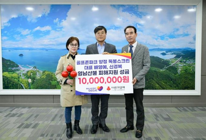 [경남도민뉴스=김부경 기자] 거제시는 15일 양정 독봉스크린 골프가 산불 피해 복구를 위해 성금 1,000만 원을 기탁했다고 밝혔다.