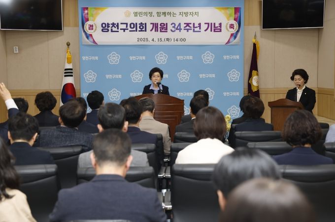 [경남도민뉴스=류종길 기자] 양천구의회는 15일 오후 2시, 개원 34주년을 맞아 기념식을 개최했다. 이날 기념식은 오해정 의회운영위원장의 사회로 진행됐으며, 공기환 부의장의 주요 의정활동 경과보고와 윤인숙 의장의 기념사, 이기재 구청장의 축사로 이어졌다.
