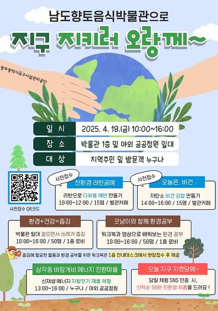 [경남도민뉴스=최현인 기자] 광주북구시설관리공단은 제55주년 지구의 날을 기념하여 오는 18일, 10:00부터 16:00까지 남도향토음식박물관 1층 및 야외 공공정원에서 ‘지구 지키러 오랑께~’ 행사를 개최한다고 밝혔다.