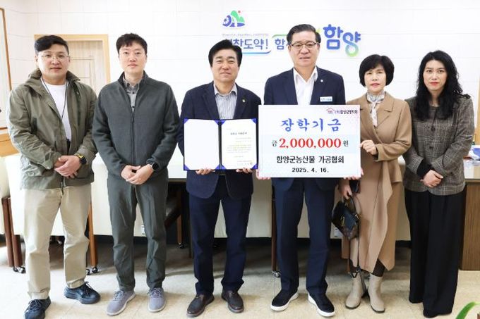 [경남도민뉴스=장광동 기자] 함양군농산물가공협회는 4월 15일, ‘수원메가쇼 2025 시즌1’에 참가한 13개 관내 업체가 뜻을 모아 마련한 수익금 200만 원을 (재)함양군장학회에 장학금으로 기탁했다.