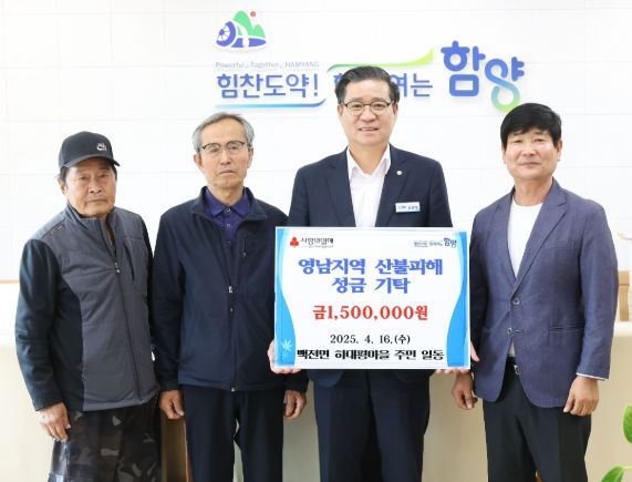 [경남도민뉴스=장광동 기자] 함양군은 4월 16일, 백전면 하대평마을 주민들과 우인토목 엔지니어링 이정훈 대표가 영남 지역 산불 피해 복구를 위한 성금을 기탁했다고 밝혔다.