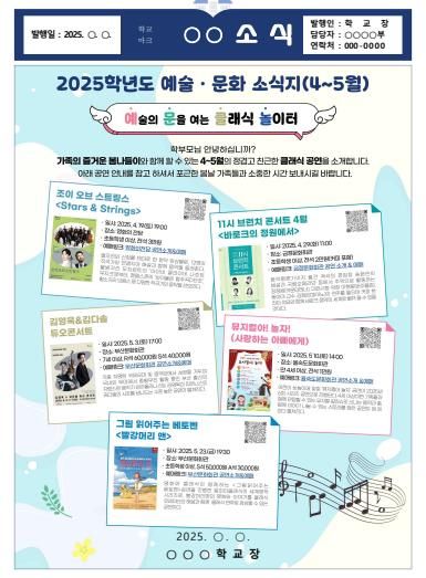 이해선 학생예술문화회관장은 “이번 소식지가 학교와 교육가족 모두에게 다양한 공연 정보를 제공해 예술을 삶에 녹여내는 계기가 되길 바란다”며 “앞으로도 다양한 공연 정보를 지속적으로 제공해 나가겠다”고 말했다.