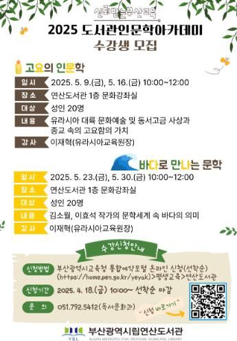 [경남도민뉴스=김채연 기자] 부산광역시립연산도서관은 오는 5월 9일부터 30일까지 매주 금요일 오전 10시부터 도서관 1층 문화강좌실에서 성인 20명을 대상으로 도서관 인문학 아카데미를 운영한다.