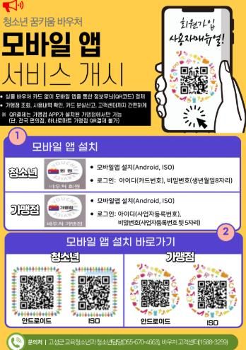 모바일앱 설치․이용과 관련한 자세한 사항은 꿈키움 카드 누리집이나 바우처 고객센터, 고성군 교육청소년과를 통해 문의하면 된다.