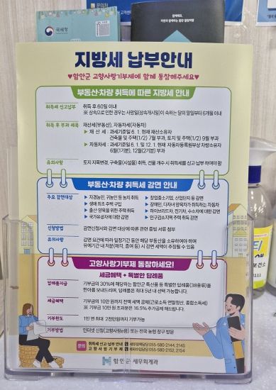 [경남도민뉴스=권중환 기자] 함안군은 관외 납세자 지방세 안내를 통한 고향사랑기부제 홍보를 위해 부동산 취득자 및 감면자에게 배부할 지방세 신고납부 안내문을 제작했다.