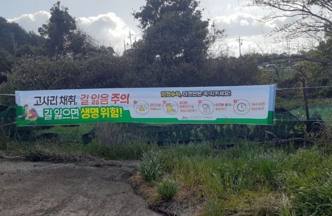 주요 내용으로는 고사리 채취객의 주요 이동 경로인 산간지역에 주의 환기를 위한 '2인 이상 함께 이동', '휴대폰 호각 등 비상용품 지참', '일몰 전 하산' 등 핵심 안전수칙이 표기된 현수막 45개소를 설치했고, 마을 앰프방송, 홈페이지, LED전광판 등 다양한 채널을 통해 비상 연락 수단 확보, 위치 공유, 깊은 산 진입 자제, 119 신고요령 등을 봄철 길 잃음 사고 예방 수칙을 집중 홍보하고 있다.