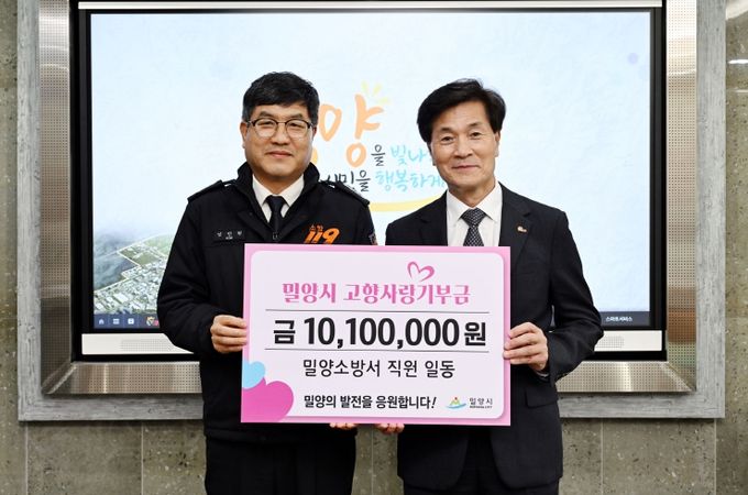 [경남도민뉴스=나희준 기자] 밀양시는 밀양소방서에서 17일 시장실을 방문해 고향사랑기부금 1,010만원을 기탁했다고 밝혔다.