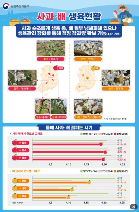 농촌진흥청, 산지 농협 및 농가 등을 통해 최근 이상기상 영향 모니터링 결과, 눈이 내리고 기온이 다소 하락했지만 개화기 이전인 사과는 육안으로 확인되는 피해는 없는 것으로 조사됐으며, 배는 저온피해 신고 면적(19개 시․군 1,639ha)이 평년(5,278ha)의 31.1% 수준으로, 해당 피해면적 내에서도 꽃눈 피해율은 10~80% 수준으로 확인되어 상주 지역 등 일부 저온피해에도 불구하고 현재까지 생육 상황이 평년보다 양호한 것으로 나타났다.