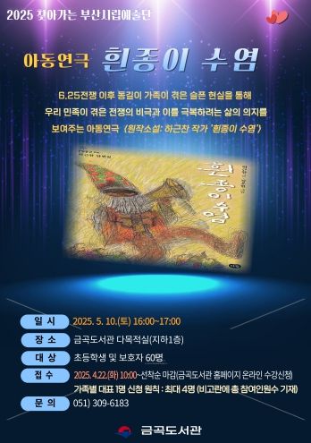 [경남도민뉴스=신석주 기자] 부산광역시 북구는 5월 가정의 달을 맞이하여 금곡도서관에서 지역 주민을 대상으로 오는 5월 10일 오후 4시에 하근찬 작가의 단편소설 『흰종이 수염』을 원작으로 한 아동 연극 공연을 개최한다.