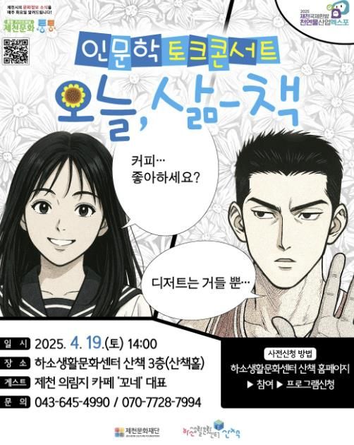 [경남도민뉴스=박만수 기자] 제천문화재단은 19일 오후 2시 하소생활문화센터 산책에서 인문학 토크 콘서트 '오늘, 삶-책'을 개최한다고 밝혔다.