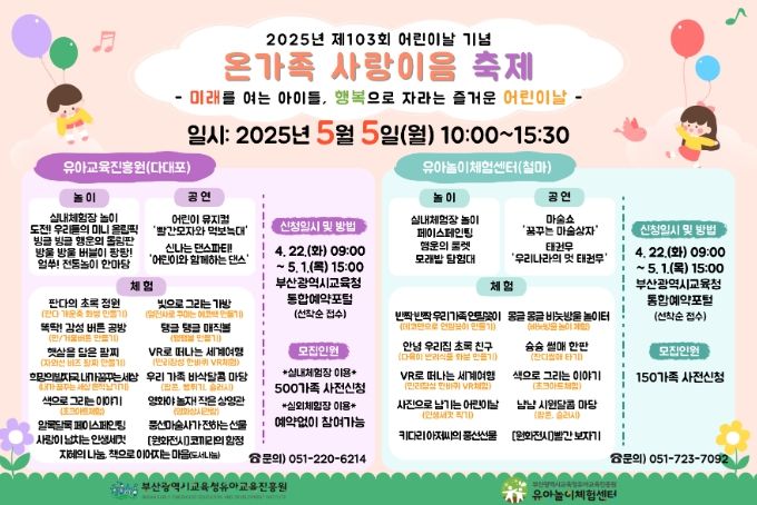[경남도민뉴스=김채연 기자] 부산광역식교육청 유아교육진흥원은 어린이날을 맞아 오는 5월 5일 오전 10시부터 다대포 유아교육진흥원과 철마 유아놀이체험센터에서 3~5세 유아, 학부모, 시민 등 2,000여 명을 대상으로 ‘온가족 사랑이음 축제’를 개최한다.