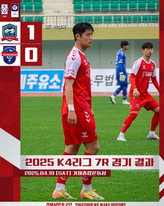 [경남도민뉴스=김부경 기자] 거제시민축구단이 지난 4월 19일 토요일 오후 2시, 거제종합운동장에서 열린 K4리그 7라운드 홈경기에서 연천FC를 1-0으로 꺾고 귀중한 승점 3점을 획득했다.