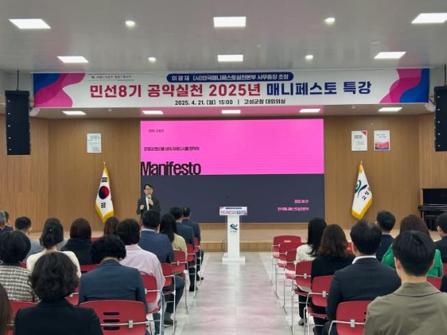 [경남도민뉴스=김태수 기자] 고성군은 4월 21일 군청 대회의실에서 매니페스토에 대한 이해와 실천 역량 강화로 공약사업을 성공적으로 추진하기 위해 공약사업 담당 공무원 100여 명을 대상으로 ‘민선8기 공약실천 2025년 매니페스토 특강’을 개최했다.