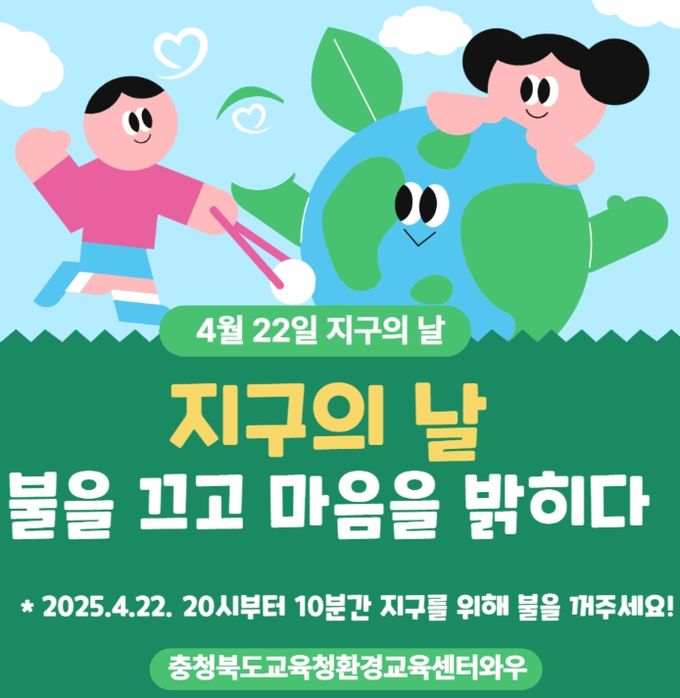 [경남도민뉴스=박만수 기자] 충청북도교육청은 4월 22일 지구의 날을 맞아 본청을 비롯한 각급 학교는 저녁 8시부터 10분간 소등행사를 진행해, 환경보호의 의미를 되새긴다.