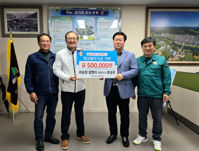 [경남도민뉴스=김춘호 기자] ㈜승현 알엔티 대표이사 류승현 씨는 22일 삼가면사무소를 방문하여 삼가중학교에 학교발전기금 50만 원을 기탁했다.