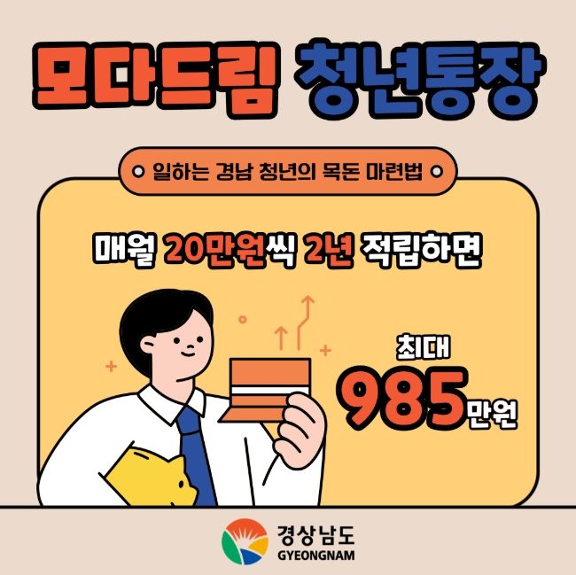 모다드림 청년통장은 일하는 청년의 목돈 마련을 돕고 경제적 자립과 지역 정착을 돕는 사업이다. 경남에서 살고·일하는 청년(18~39세)이 월 20만 원씩 2년간 적립하면 만기 시 도와 시군이 총 480만 원의 청년지원금을 지급한다. 이자까지 포함하면 최대 985만 원의 목돈을 마련할 수 있어 독립, 결혼 등 생애 전환기를 맞는 청년들에게 실질적 도움이 되고 있다.