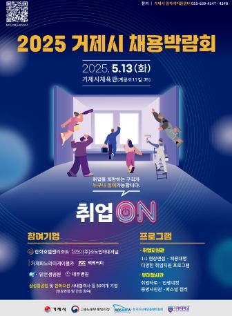 [경남도민뉴스=김부경 기자] 거제시가 지역기업과 구직자들의 맞춤형 일자리 매칭을 위해 다음 달 13일 오후 1시부터 5시까지 거제시 체육관에서 ‘2025 거제시 채용박람회 취업 ON’을 개최한다고 밝혔다.
