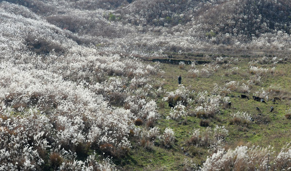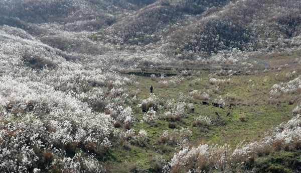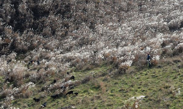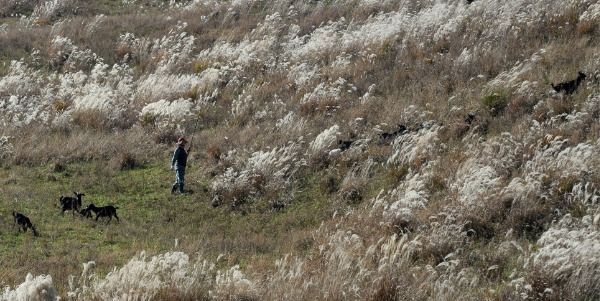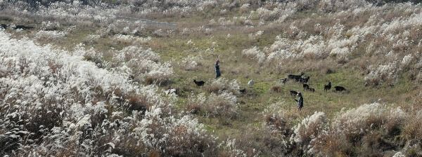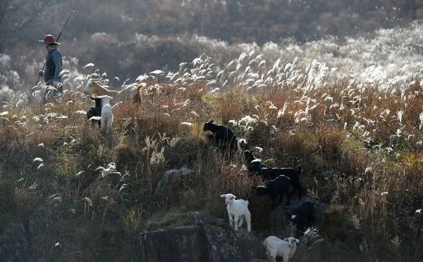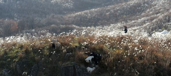 [경남도민뉴스] 16일 경남 거창군 웅양면 군암목장에 가을 햇살 머금은 은빛 억새들 사이로 염소들이 풀을 뜯어 먹고 있다.