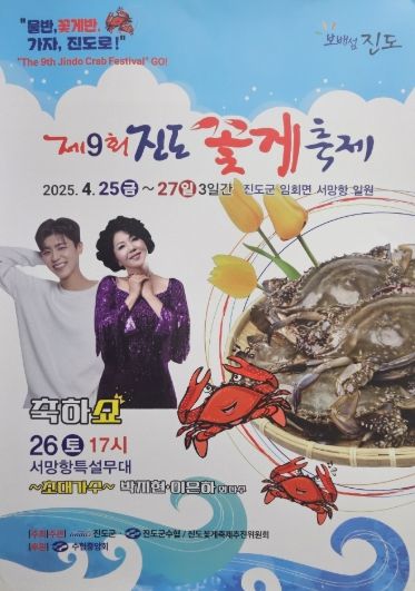 진도군과 진도군수협은 오는 4월 25일부터 27일까지 진도 서망항 일원에서 제9회 진도 꽃게 축제를 개최할 예정이며, 꽃게 깜짝 경매, 트로트 가요제, 난타 공연 등 다양한 즐길 거리가 준비돼 있다.