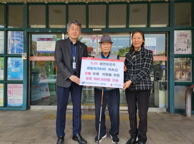 같은 날, 동춘1동 행정복지센터는 6·25전쟁 참전유공자 최달식(98세) 어르신으로부터 작은 정성이지만 도움이 필요한 산불 피해 이웃을 위해 써달라며 50만 원을 전달받았다.