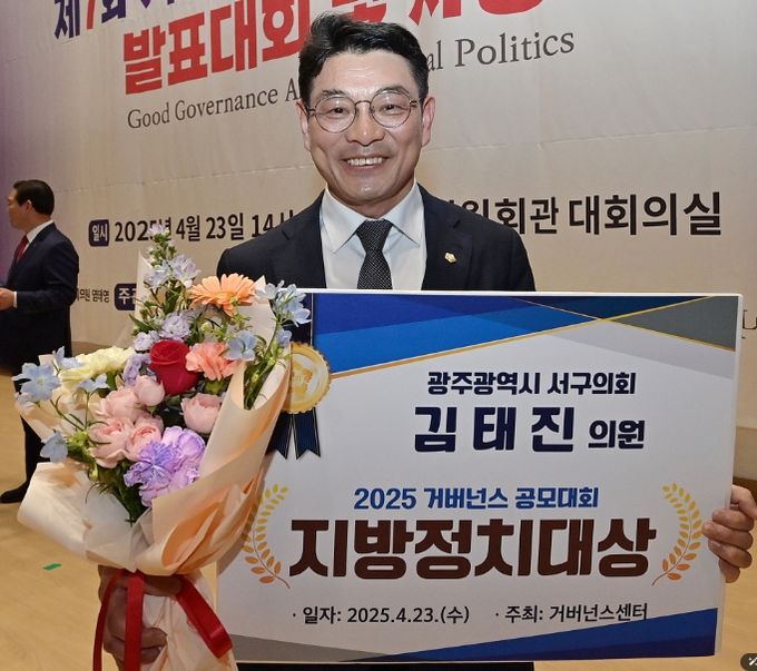 [경남도민뉴스=최현인 기자] 광주광역시 서구의회 김태진 의원이 23일 국회의원회관 대회의실에서 거버넌스 지방정치대상이 주관하는 수상식에서 갈등해소·사회통합 분야에서‘최우수상’을 수상하는 영예를 안았다.