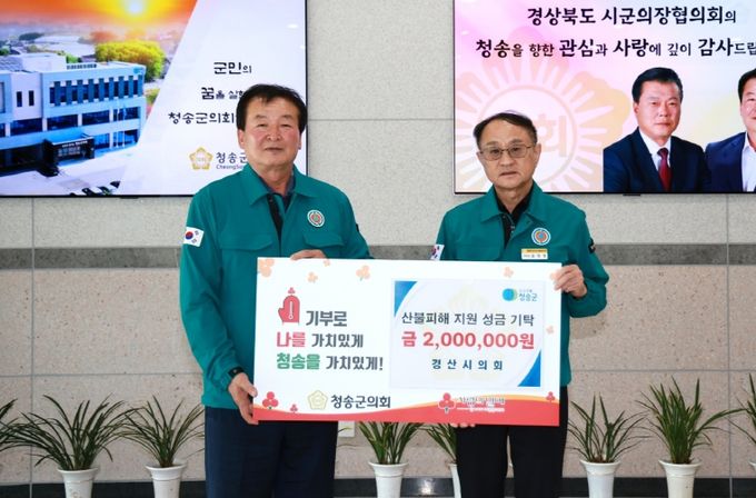 4월 24일 청송군의회를 직접 방문해 100만 원의 성금을 전달했으며, 시·군의회의장협의회를 통해 전달한 성금 100만 원은 피해 지역에 추가로 기탁했다.
