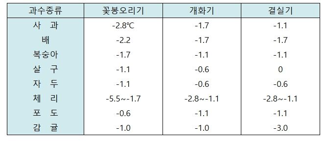 사과는 영하 1.7도, 배는 영하 1.7도, 복숭아는 영하 1.1도 정도에서 저온 피해를 볼 수 있다. 작목별 개화기 전후 저온 피해 한계 온도보다 약간 높은 온도에서도 저온에 노출되는 시간에 따라 피해가 발생할 수 있어 주의가 필요하다.