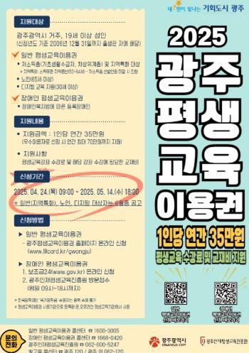 [경남도민뉴스=최현인 기자] 광주광역시는 시민 누구나 배움의 기회를 누릴 수 있도록 ‘평생교육이용권 지원사업’을 확대 시행한다.