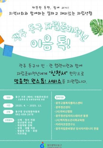 [경남도민뉴스=최현인 기자] 광주 동구는 자립준비청년의 안정적이고 건강한 자립을 지원하기 위해 민관 기관들과 협력해 맞춤형 서비스 연계망 사업인 ‘광주 동구 자립준비 청년 이음 톡’을 구축했다고 밝혔다.