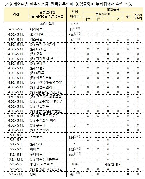 이번 할인행사는 가정의 달을 맞아 소비자에게 한우를 저렴하게 제공하기 위해 마련됐으며, 4월 30일부터 5월 11일까지 대형마트 3사와 농협 하나로마트 등 전국 온·오프라인 30개 업체, 1,745개 매장에서 진행된다.