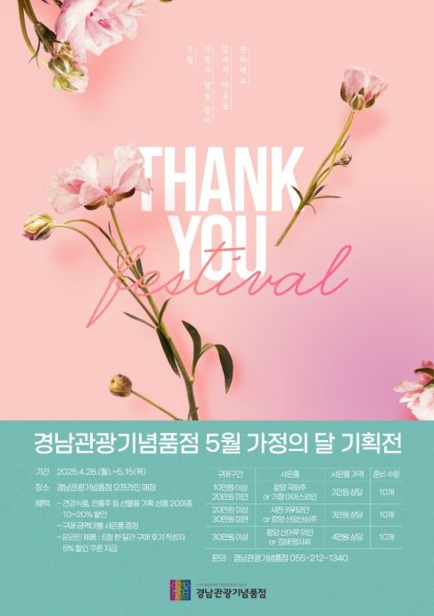 [경남도민뉴스=구인애 기자] 경상남도는 가정의 달을 맞아 4월 28일부터 5월 15일까지 '경남관광기념품점 5월 가정의 달 특별 기획전'을 진행한다고 밝혔다.