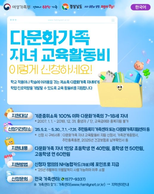 경남도는 다문화가족 자녀에게 교육활동비를 지급해 학습 격차를 해소하고 미래 인재로 성장할 수 있도록 여성가족부와 함께 지난해부터 시행하고 있다.
