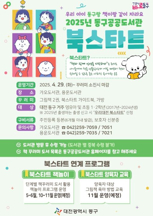 [경남도민뉴스=도문호 기자] 대전 동구는 생애 초기 올바른 독서 습관 형성을 지원하기 위해 ‘2025년 북스타트 사업’을 본격 추진, 오는 29일부터 선착순 참여자를 모집한다고 밝혔다.
