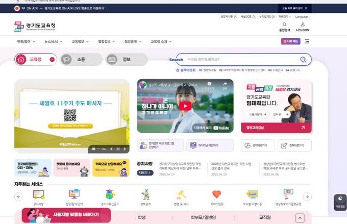 [경남도민뉴스=김동규 기자] 경기도교육청이 새로운 공식 누리집(홈페이지)을 28일 본격 개통했다. 사용자 편의성과 정보 접근성을 대폭 향상해 경기교육의 대표 소통 창구로서 역할을 충실히 담당할 것으로 기대된다.