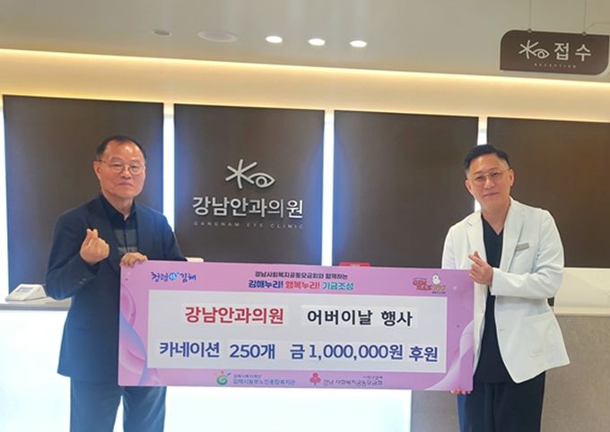 [경남도민뉴스=최미정 기자] (재)김해시복지재단(대표이사 임주택), 김해시동부노인종합복지관(관장 정순미)에서 지난 25일 금요일 강남안과의원(원장 박기범) 제53회 어버이날을 맞이하여 카네이션 250개 금100만원 상당의 후원 전달식을 진행했다.