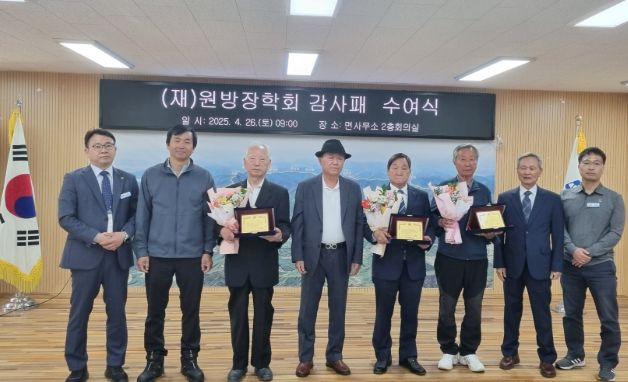 [경남도민뉴스=장광동 기자] (재)원방장학회(이사장 신평수)는 지난 26일 ‘2025년 마천초·중학교 총동문 대축제’를 맞아, 원방장학회의 인재 육성과 교육 환경 개선 및 발전을 위해 오랜 기간 헌신해 온 김흥식, 김갑수, 김양일 씨에게 감사패를 전달했다고 밝혔다.