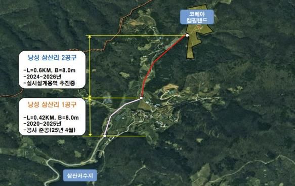 시는 현재 설계 중인 낭성 삼산리(2공구) 농어촌도로 연장 0.6km 구간에 대해, 2026년 공사를 완료해 전체구간(2.6km)을 개통할 수 있도록 추진할 방침이다. 사업이 완료되면 코베아가 조성을 추진하고 있는 캠핑랜드까지도 이어진다.