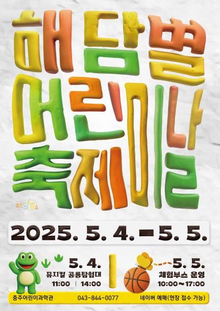 [경남도민뉴스=박만수 기자] 충주시는 충주어린이과학관에서 어린이날을 기념해 5월 4일과 5일 이틀간 지역 어린이와 가족이 함께 참여할 수 있는 ‘해담별 어린이날 축제’를 개최한다고 밝혔다.