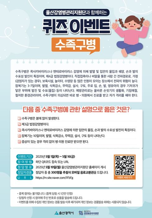 [경남도민뉴스=최재경 기자] 울산시는 감염병관리지원단과 공동으로 5월 1일부터 5월 16일까지 계절성 감염병(수족구병) 예방 시민의식 제고와 예방 수칙 홍보를 위한 감염병 예방 온라인 퀴즈 행사(이벤트)를 진행한다고 밝혔다.