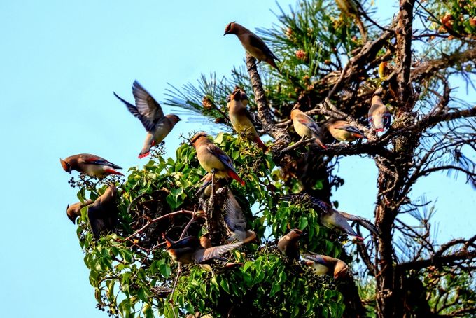 황여새와 섞여 먹이를 찾는 홍여새는 외양이 서로 비슷하다.