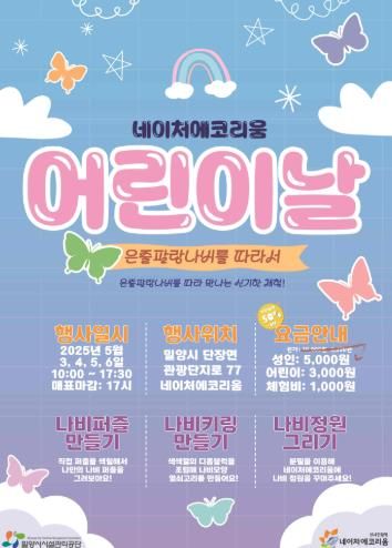 [경남도민뉴스=나희준 기자] 밀양시시설관리공단은 어린이날을 맞이해 선샤인 밀양 테마파크 내 네이처 에코리움에서 오는 5월 3일부터 6일까지 4일간‘은줄팔랑나비를 따라서’체험 행사를 개최한다고 29일 밝혔다.
