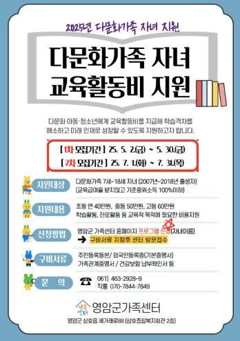 [경남도민뉴스=최인태 기자] 영암군가족센터가 올해 5/2일부터 ‘2025년 다문화가족 자녀 교육활동비 지원사업’에 돌입한다.