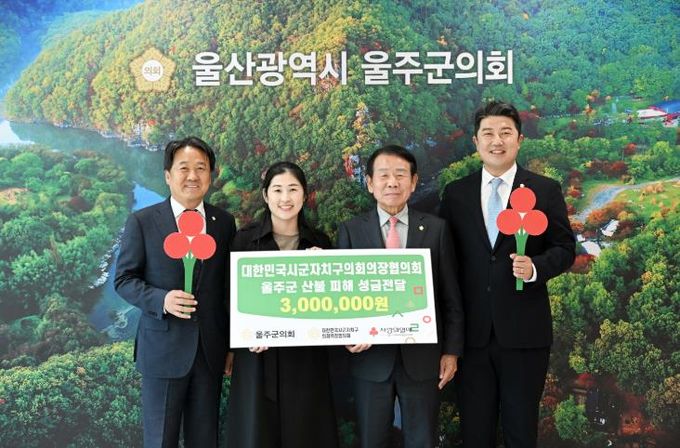 [경남도민뉴스=최재경 기자] 대한민국시군자치구의회 의장협의회가 울주군 산불 피해복구지원을 위한 성금 300만원을 기탁했다.