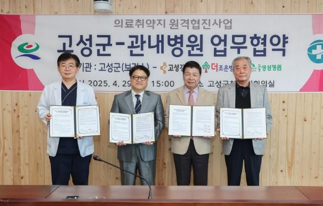 [경남도민뉴스=김태수 기자] 고성군은 4월 29일 군청 열린회의실에서 정보통신기술을 활용한 의료취약지 원격협진사업 추진을 위해 강병원, 더조은병원, 고성성심병원과 협약을 체결했다고 밝혔다.