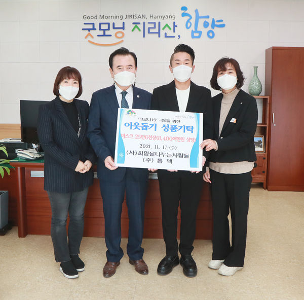 [경남도민뉴스] 함양군은 지난 11월 17일 ‘(사)희망을나누는사람들’에서 코로나19 극복을 위한 이웃돕기 성품 마스크 25만 6천장(8,400여만원 상당)을 기탁했다고 밝혔다.