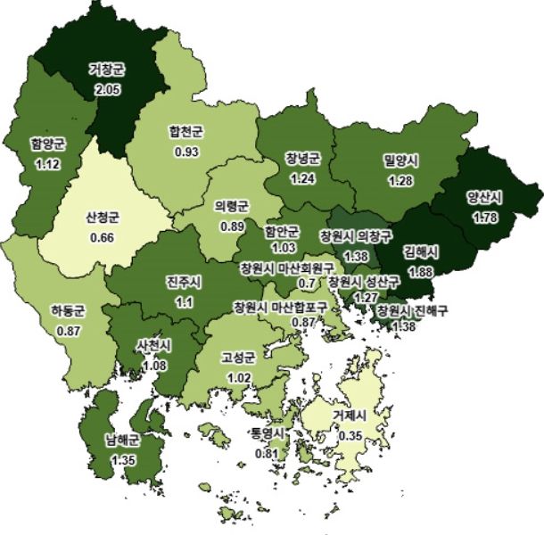 시군별로는 거창군이 2.05%로 가장 높은 변동률을 보였고, 김해시(1.88%), 양산시(1.78%), 창원시 의창구·진해구(1.38%) 순으로 나타났다. 반면, 거제시는 0.35%로 가장 낮은 변동률을 기록했다.