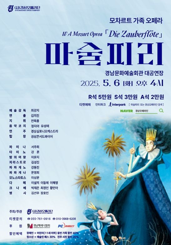 [경남도민뉴스=구인애 기자] 경남 지역 대표적 오페라단이자 국내에서 가장 활발하게 활동 중인 오페라단인 (사)경상오페라단(예술감독 최강지 경상국립대학교 음악교육과 교수)이 제작한 모차르트의 가족 오페라 '마술피리'가 경남문화예술회관 대공연장에서 어린이날 연휴 마지막 날인 5월 6일 오후 4시에 진주의 가족 관객을 맞이한다.