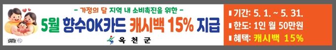[경남도민뉴스=박만수 기자] 옥천군이 가정의 달 5월을 맞아 한달 동안 옥천사랑상품권(향수OK카드) 캐시백 혜택을 당초 10%에서 15%로 상향한다.
