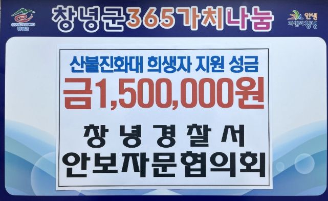 [경남도민뉴스=김병현 기자] 창녕군은 창녕경찰서 안보자문협의회(회장 서헌덕)가 창녕군 산불진화대 피해자 지원을 위해 성금 150만 원을 기탁했다고 1일 밝혔다.