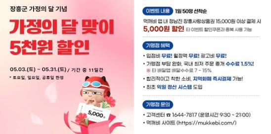 [경남도민뉴스=최인태 기자] 장흥군이 5월 가정의 달을 맞아 지역사랑상품권 활용을 통한 지역경제 활성화를 위해 공공배달앱 먹깨비 장흥군 주말 할인 이벤트를 실시한다.